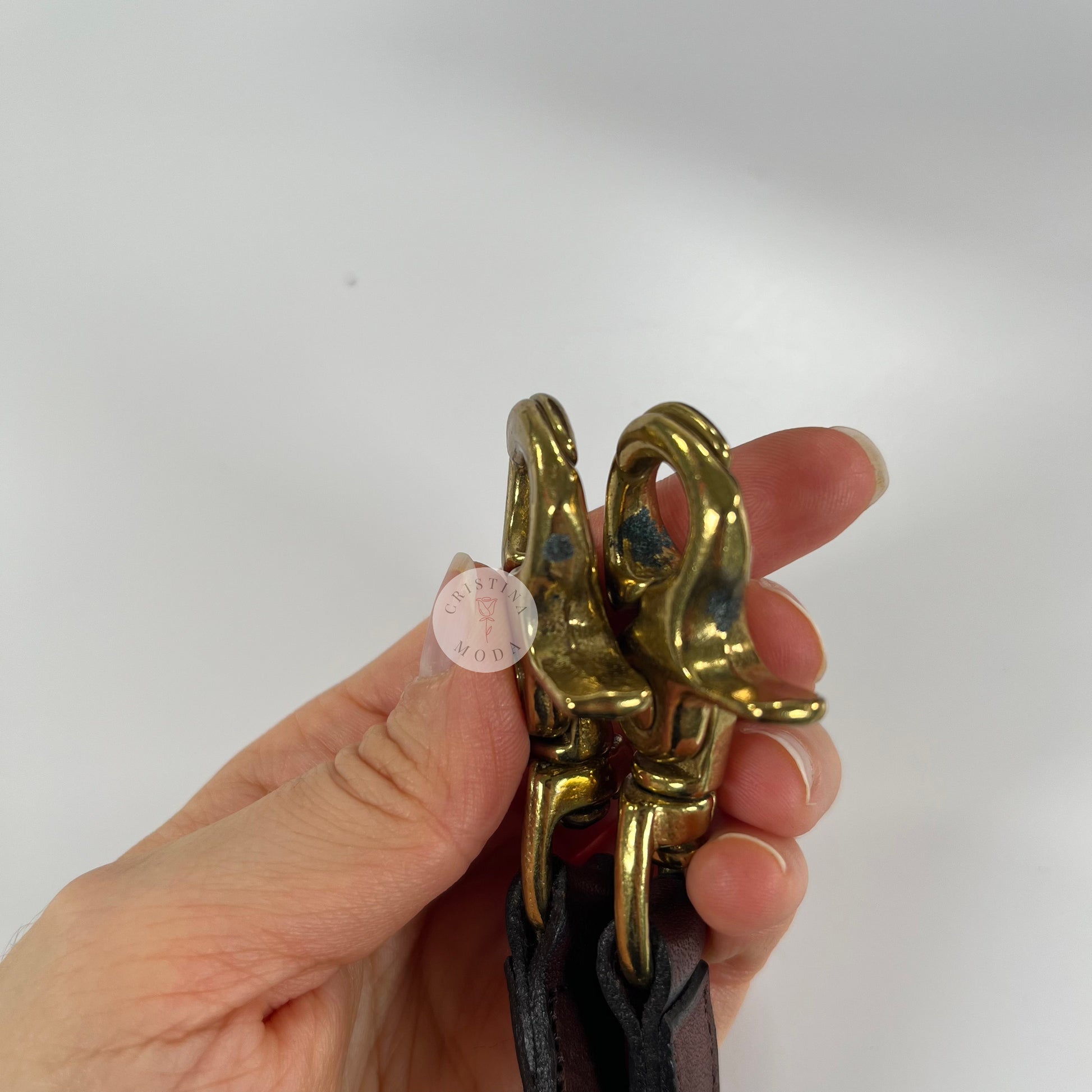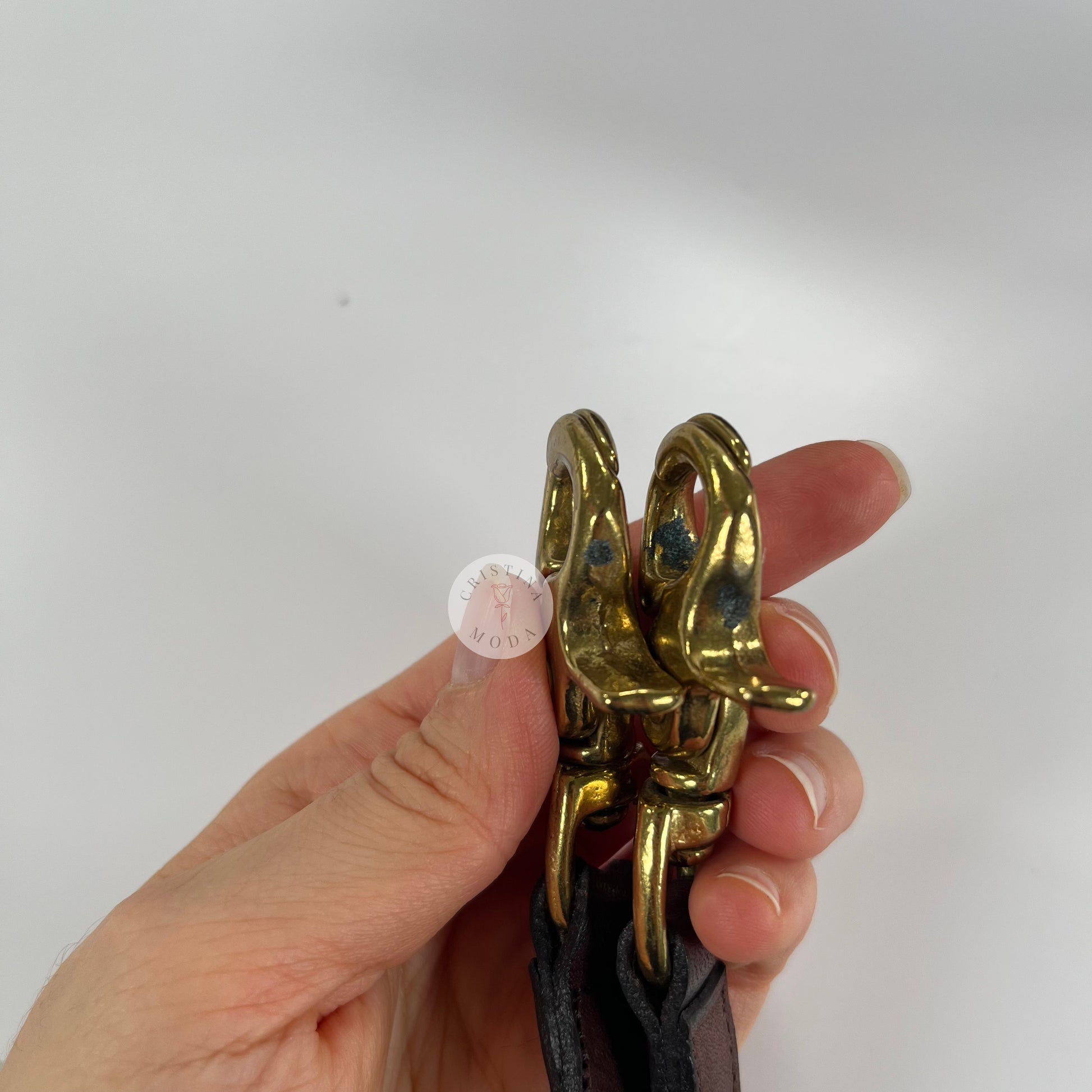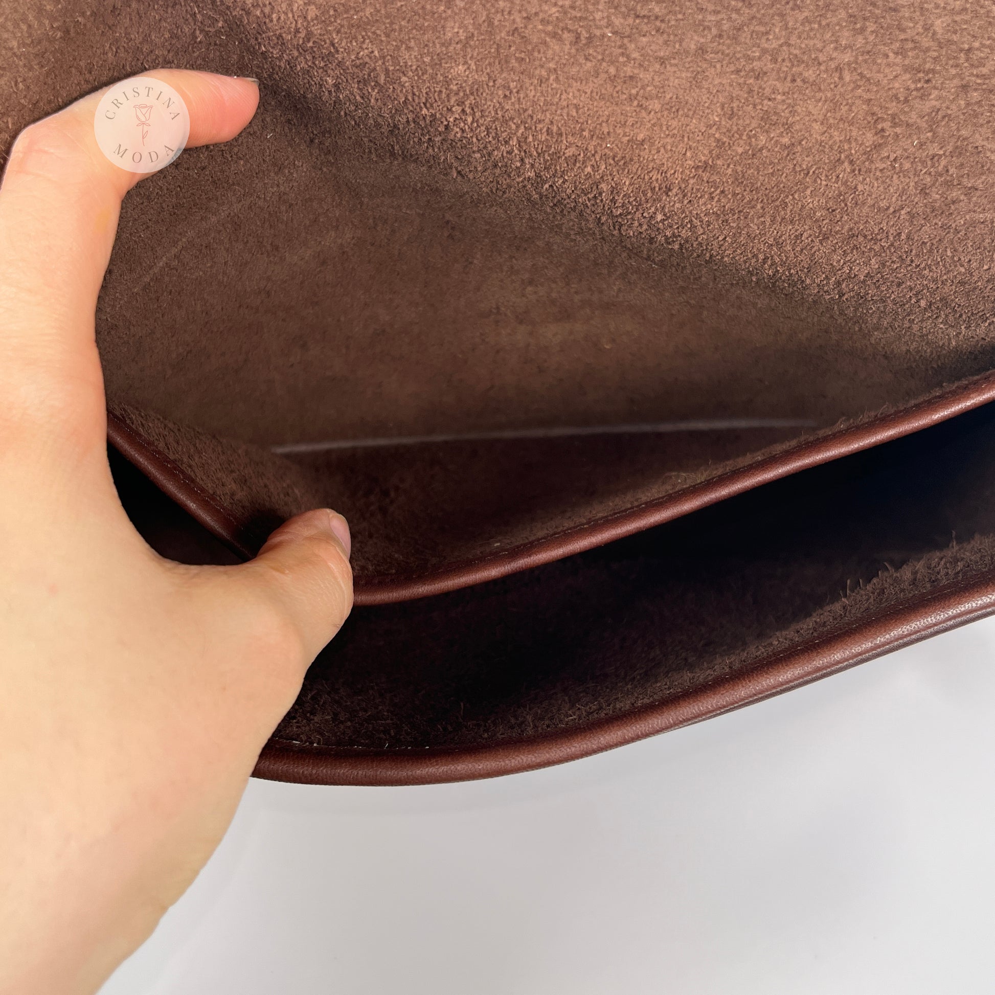 Condition- some very mild normal wear throughout, as shown in photos. Please note that there is a mark on the inside of the back pocket that appears to likely be a scar in the leather and there's some tarnish on the brass hardware, please see close up photos. Overall, very nice vintage condition!